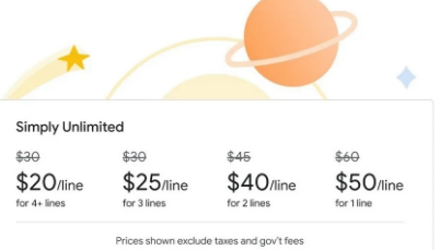 对于四行或更多行的SimplyUnlimited,您现在将每月为每位订阅者支付20美元,低于30美元。对于三行,您现在每月为每位订阅者支付25美元,也低于30美元。两条线路现在每个订阅者每月40美元(低于45美元),一条线路的每月价格已从60美元降至50美元。