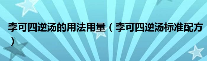 大家好,小晋来为大家解答以下问题,关于李可四逆汤的用法用量,李可四逆汤标准配方很多人还不知道,今天让我们一起来看看吧!