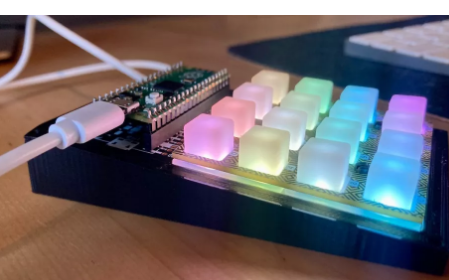 Rouberol很好心地分享了最终项目的演示视频,展示了它是如何工作的。它的顶部有一个 Pico,以及一个由 RGB LED 照亮的 4 x 4 键盘。每个键都与音轨或控制机制相对应,以调整音量等内容,甚至重叠音频,以便可以同时播放多个音轨。键盘通过串行连接将数据发送到运行Python应用程序的计算机,该应用程序读取输入并播放相关声音文件。PC上的媒体播放使用PyGame进行处理,PyGame是一种流行的Python模块,用于创建游戏。