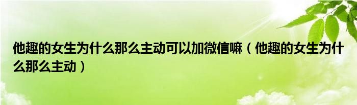 大家好,慧慧来为大家解答以上问题,他趣的女生为什么那么主动可以加微信嘛,他趣的女生为什么那么主动很多人还不知道,现在让我们一起来看看吧!