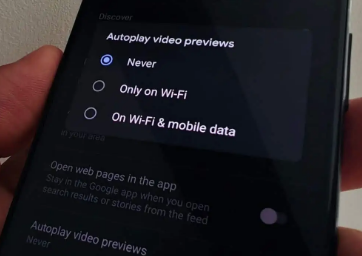 如果您进入该菜单,将出现一个新的弹出菜单,向您显示三个选项。“从不”选项将禁用GoogleDiscover中的视频自动播放,因此您需要选择该选项。但是,除此之外,您还有“仅在Wi-Fi上”和“在Wi-Fi和移动数据上”。或者,您可以保持视频自动播放开启,但将其限制为仅在您连接到Wi-Fi时播放。