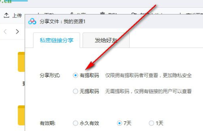 第三步:进入分享文件界面后,勾选“有提款码,仅限有提款码者查看,更加隐私安全”。